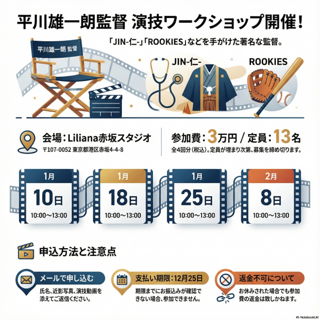 株式会社リリアナより、平川雄一朗監督による演技ワークショップ開催のお知らせです!